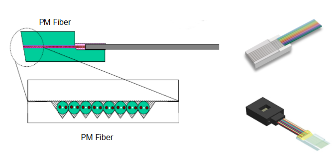 PM fiber array is used in fiber optic sensing, photonic waveguide devices, WDM/DWDM systems, AWG, fiber collimators, PLC splitter, optical switches, optical transceiver modules, power monitoring systems, interferometry, fiber optic gyro, fiber optic hydrophones, optical signal distribution, coherent detection systems, long-haul, metro networks, data center, etc.